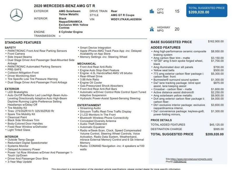 2020 Mercedes-Benz AMG GT R RWD V8 AMG Solarbeam Yellow Metallic Clean CARFAX, * **All Maintenance Up to Date**, Active Distance Assist DISTRONIC, AMG Exterior Carbon Fiber Package I, AMG Exterior Carbon Fiber Package II, AMG High-Performance Composite Braking System, Black DINAMICA Headliner, Blind Spot Assist, Burmester High-End 3D Surround Sound System, Burmester Surround Sound System, Carbon Fiber Rear Fixed Wing w/Lateral End Plates, Exclusive Interior Package, Extended Interior Lighting, Heated Front Seats, Lane Keeping Assist, Lane Tracking Package, Navigation System, Power Heated AMG Performance Seats w/Memory, Touchpad, Wheels: 19'' Fr/20'' Rr AMG Forged 10-Spoke Black, Yellow Seat Belts. Recent Arrival! Odometer is 2272 miles below market average!
