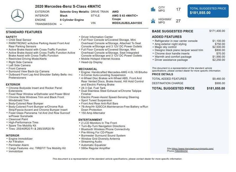2020 Mercedes-Benz S-Class S 63 AMG 4MATIC 4MATIC 4.0L V8 Selenite Gray One Owner, Clean CARFAX, AWD, Navigation, Sunroof, Leather Seats, Heated Seats, Backup Camera, Memory Seats, Cooled Seats, Premium Sound System, Premium Audio, Multi-Zone Climate Control, 4MATIC, Black w/Perforated Nappa Leather Upholstery, Active Multicontour Front Seats w/Massage Feature, AMG Exterior Night Styling, Apple CarPlay, Apple CarPlay/Android Auto, Black DINAMICA Headliner, Burmester Surround Sound System, designo Black Piano Lacquer Wood Trim, DISTRONIC PLUS w/Steering Assist, Driver Assistance Package Plus, Heated Rear Seats, Heated Steering Wheel, LED Lighting, MAGIC SKY CONTROL, Navigation System, Refrigerator in Rear Center Console, Speed Limit Takeover, Touchpad For COMAND, Ventilated Front Seats, Ventilated front seats, Warmth & Comfort Control Code, Warmth & Comfort Package, Wheels: 20'' AMG 5-Spoke Titanium w/Black Accents. Recent Arrival! 17/27 City/Highway MPG