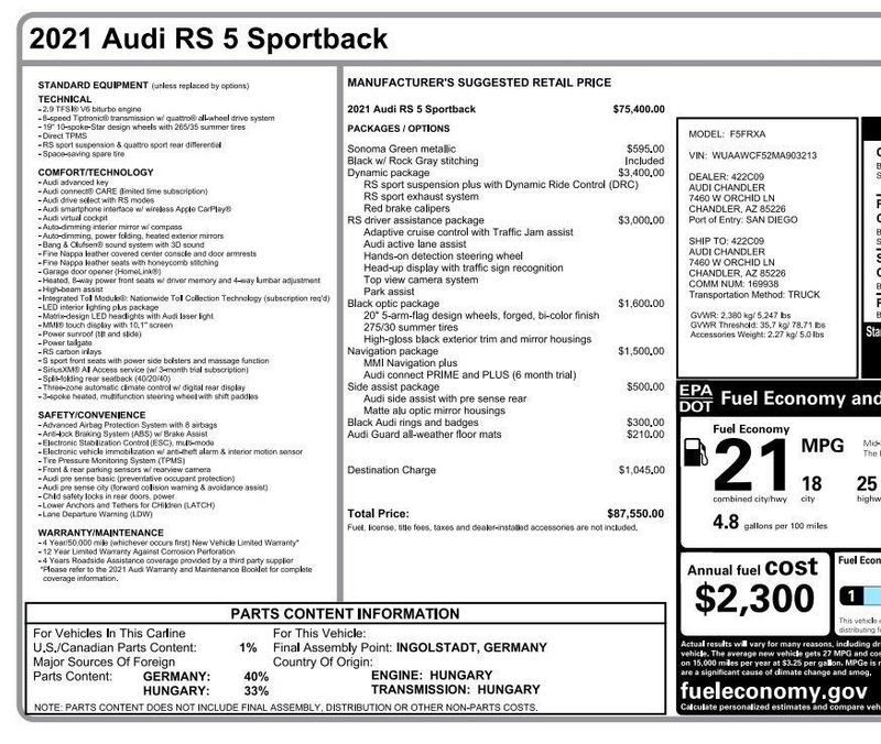 2021 Audi RS 5 2.9T quattro quattro 2.9L V6 Turbocharged DOHC 24V LEV3-ULEV70 444hp Sonoma Green Metallic AWD, Navigation, Sunroof, Leather Seats, Heated Seats, Backup Camera, Memory Seats, Cooled Seats, Premium Sound System, Adaptive Cruise Control w/Traffic Jam Assist, Audi Active Lane Assist, Audi Connect PRIME & PLUS, Audi Pre-Sense Rear, Audi Side Assist, Black Audi Rings & Badges (4ZP), Black Optic Package, Dynamic Package, Exterior Mirror Housings in High-Gloss Black, Front Spoiler Trim in High-Gloss Black, Hands-On Detection Steering Wheel, Head-Up Display, High-Gloss Black Exterior Elements, Matte Alu Optic Exterior Mirror Housing, MMI Navigation Plus, Navigation Package, Navigation System, Park Assist, Rear Diffuser Trim in High-Gloss Black, Red Brake Calipers, RS Driver Assistance Package, RS Sport Exhaust System w/Black Tips, RS Sport Suspension Plus w/Dynamic Ride Control, Side Assist Package, Top View Camera System, Traffic Sign Recognition, Wheels: 20'' 5-Arm-Flag Forged Design. Recent Arrival! Priced below KBB Fair Purchase Price! Odometer is 23499 miles below market average!