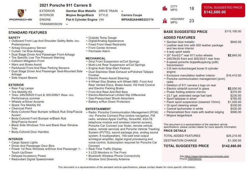2021 Porsche 911 Carrera S 3.0L H6 Turbocharged DOHC 24V LEV3-ULEV70 443hp Blue Clean CARFAX, Navigation, Sunroof, Leather Seats, Heated Seats, Backup Camera, Memory Seats, Cooled Seats, Premium Sound System, Premium Audio, Multi-Zone Climate Control, Bluetooth, Hands-Free, USB Port, 23.7 Gal. Extended Range Fuel Tank, 4-Way Sport Seats, ABS brakes, Adaptive suspension, Alloy wheels, Ambient Lighting, BOSE Surround Sound System, Central Tachometer in White, Deletion of 911 Carrera S Logo on Rear, Deviated Stitching Interior Package, Electronic Stability Control, Exclusive Manufaktur Leather Interior, Four wheel independent suspension, Front dual zone A/C, GT Sport Steering Wheel, Heated door mirrors, Heated front seats, Illuminated entry, Lane Change Assist (LCA), Leather Seat Trim, Low tire pressure warning, Lthr Seat Trim w/930 Leather Pkg & Two-Tone Interior, Navigation system: Porsche Communication Management (PCM), PASM Sport Suspension (Lowered 10mm), Personalized Floor Mats w/Leather Edging, Porsche Communication Management, Porsche Dynamic Light System Plus (PDLS+), Power Folding Exterior Mirrors, Premium Package, Remote keyless entry, Security system, Sport Chrono Package, Sport Exhaust System w/Tailpipes in Silver, Sport Package, Sport Tailpipes in Silver, Storage Package, Surround View, Traction control, Ventilated Front Seats, Wheels: 20'' Front/21'' Rear 911 Turbo.
