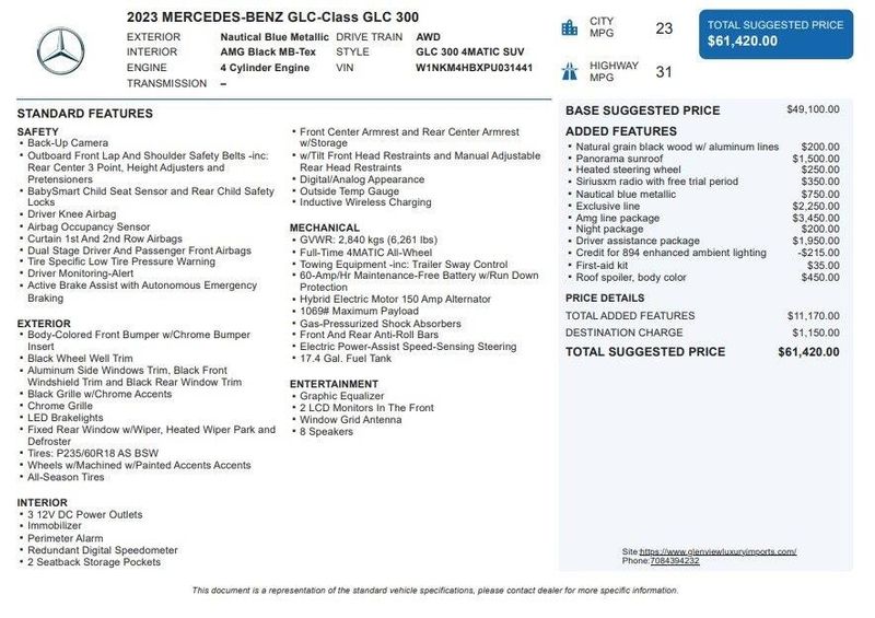 2023 Mercedes-Benz GLC 300 4MATIC 4MATIC I4 Nautical Blue Metallic One Owner, AWD, Navigation, Sunroof, Leather Seats, Heated Seats, Backup Camera, Memory Seats, Premium Sound System, Advanced USB Package, AMG Line, AMG Line Body Styling, AMG Line Exterior, AMG Line Floor Mats, AMG Line Interior, Black Roof Rails, Burmester 3D Surround Sound System, DISTRONIC PLUS w/Steering Assist, Driver Assistance Package, Driver Assistance Package Plus, Enhanced Ambient Lighting, Exclusive Trim Package, Flat-Bottom Multifunction Sport Steering Wheel, GUARD 360 Protection, High-Gloss Black Elements, Illuminated Door Sills, MB Navigation, MB-Tex Dashboard w/Nappa Look, Music Streaming, Navigation System, Night Package, Panorama Sunroof, Perforated Brake Discs, PRE-SAFE PLUS, Sound Personalization, Surround View System, Wheel Arch Trim Painted in Body Color, Wheels: 19'' AMG 5-Spoke w/ Black Accents. Recent Arrival! 23/31 City/Highway MPG
